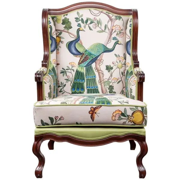 Дизайн кресла выглядит словно иллюстрации мифологического «волшебного сада» и его сказочных павлинов, притаившихся среди невероятного сплетения ветвей гранатового дерева. Пышную роскошь европейского рококо балансирует благородная грация восточного стиля «шинуазри», с XVII века признанного синонимом интерьерного изыска.